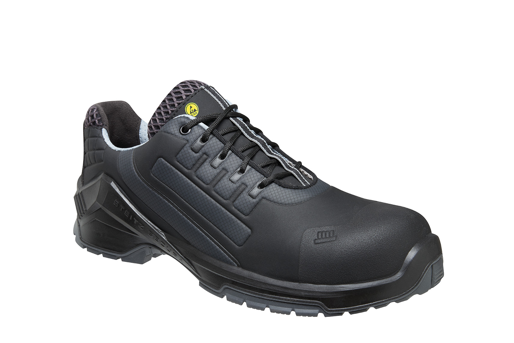 Ultra-lightweight and smooth microfibre, comfortable fit due to seamless shoe design, toe guard, with extra non-slip Perbunan outsole and textile puncture resistance, dust guard tongue, functional lining made of breathable textile and microfibre, removable comfort insole ERGO-SOFT ESD